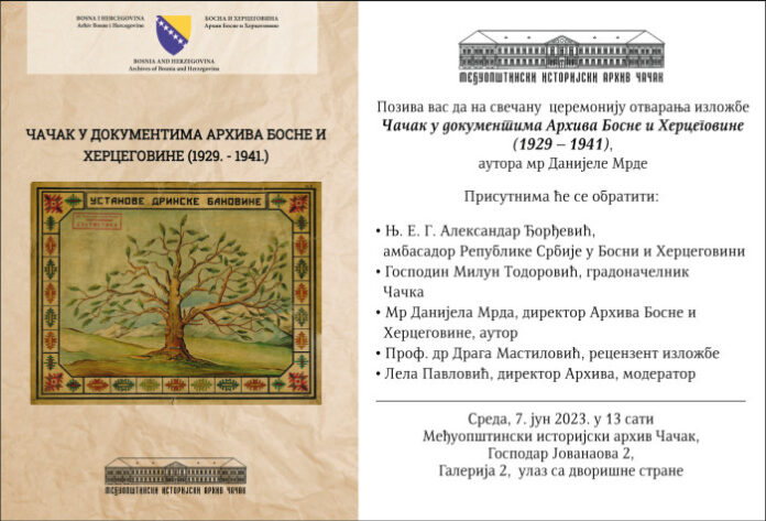ČAČAK – U Galeriji 2 Međuopštinskog istorijskog arhiva u Čačku u sredu, 7. juna, biće otvorena izložba “Čačak u dokumentima Arhiva Bosne i Hercegovine (1929-1941)“.