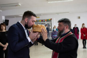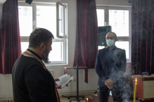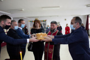 Domaćin slave Mirko Ivanović dočekao je sveštenika Mirka Mandića i uz prisustvo direktora škole, profesora Zorana Ilića, i kolektiva prerezao slavski kolač.