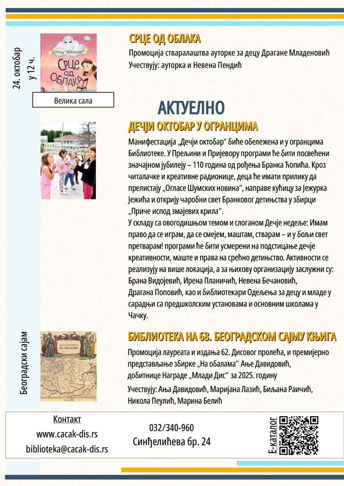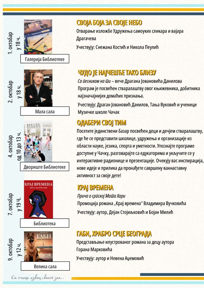 Kultura Bogat program Gradske biblioteke za septembar 2. oktobar 2025. 0 87 ČAČAK – Gradska biblioteka “Vladislav Petković Dis“ i u oktobru organizuje veoma kvalitetan i raznovrstan program. Izvor: Morava info