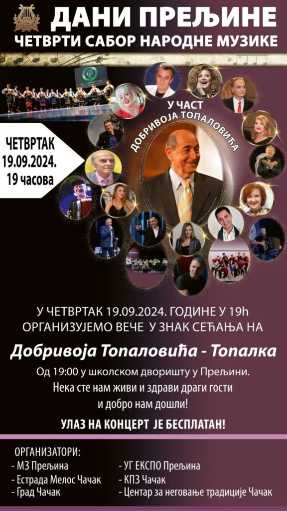 ČAČAK – U četvrtak, 19. septembra, sa početkom u 19 sati, u dvorištu OŠ “Preljina“ održaće se ćetvrti po redu sabor narodne muzike “Dani Dobrivoja Topalovića“.