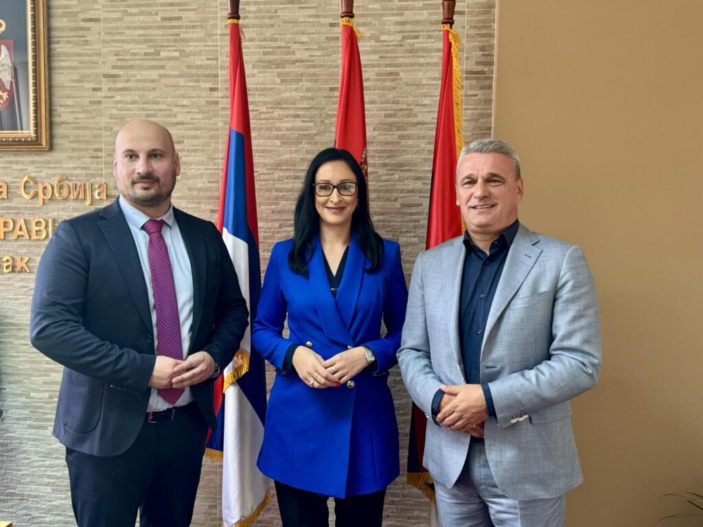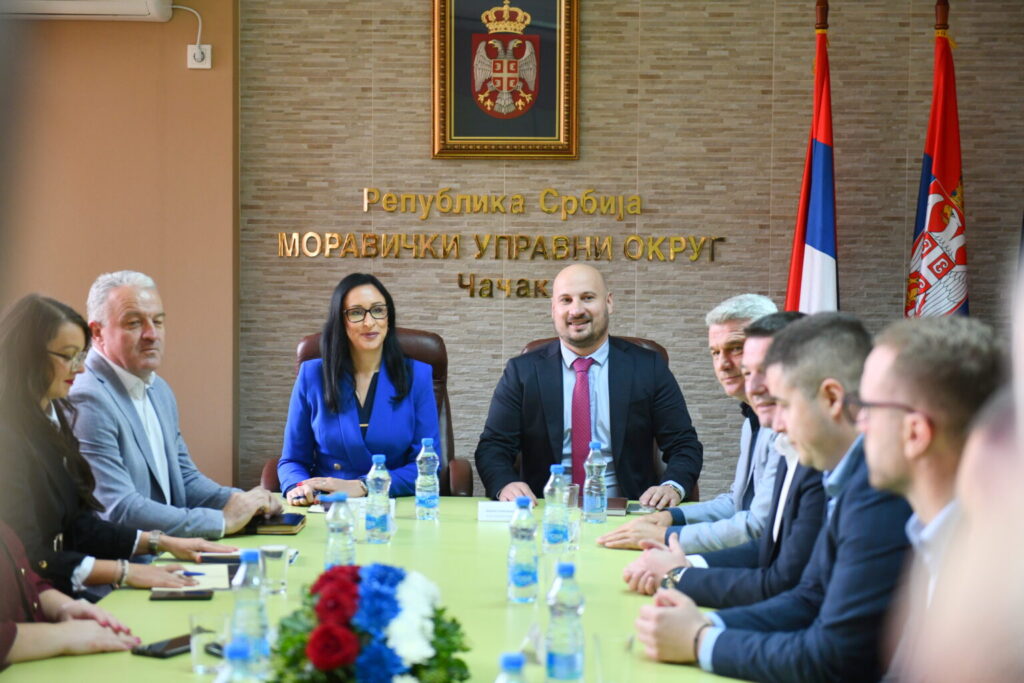 ČAČAK – Ministarka državne uprave i lokalne samouprave Jelena Žarić Kovačević održala je danas u sedištu Moravičkog upravnog okruga sastanak sa načelnikom Markom Parezanovićem, državnim sekretarom u Ministarstvu za javna ulaganja Bobanom Birmančevićem, gradonačelnikom Čačka Milunom Todorovićem i predsednicima opština Gornji Milanovac, Lučani i Ivanjica.
