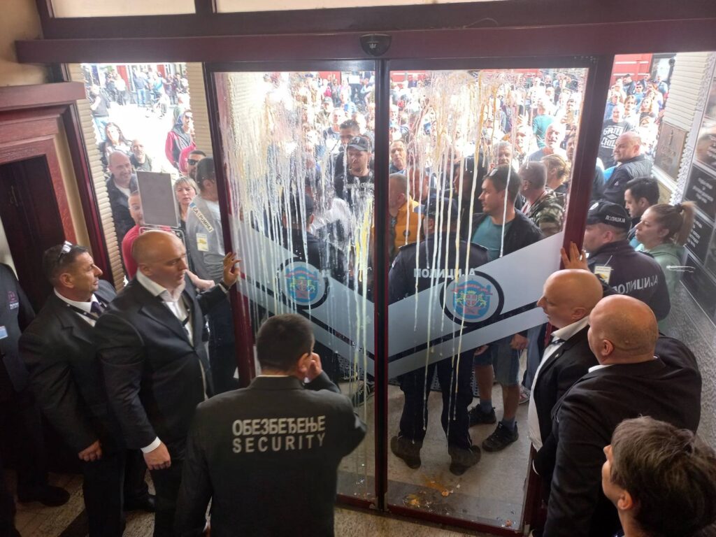 U jednom trenutku kod ulaznih vrata u zgradu Skupštine pojavio se predsednik lokalnog parlamenta Igor Trifunović, koga su protestanti zasuli jajima, a nekoliko ga je i pogodilo.