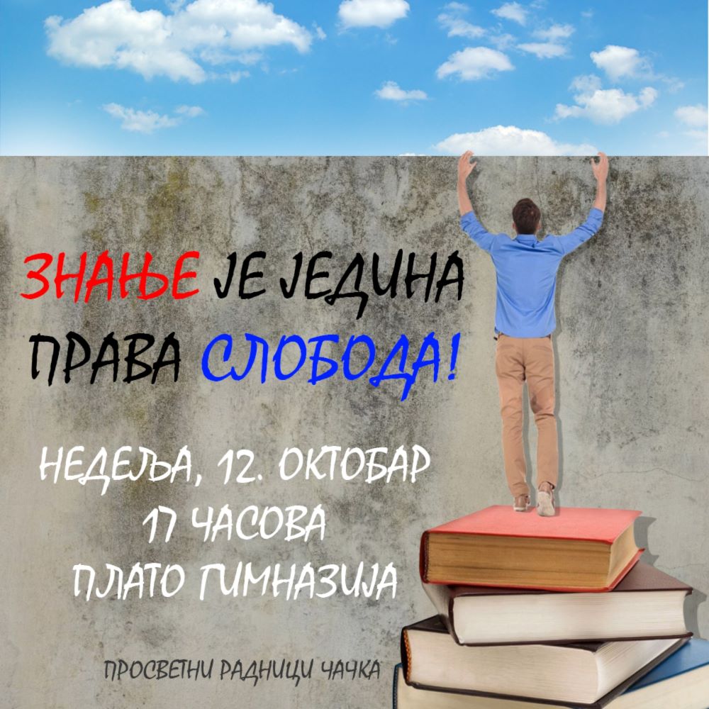 ČAČAK – Sindikat obrazovanja Čačak (SOČ) saopštio je da će u nedelju, 12. oktobra, u 17 časova, na platou ispred Gimnazije u Čačku biti održan protestni skup pod sloganom “Znanje je jedina prava sloboda“.