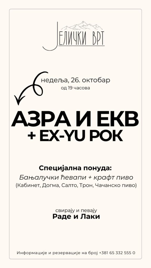ČAČAK – U restoranu “Jelički vrt“ u Gornjoj Atenici u nedelju, 26. oktobra, biće organizovano veče pesama sastava EKV i Azra.