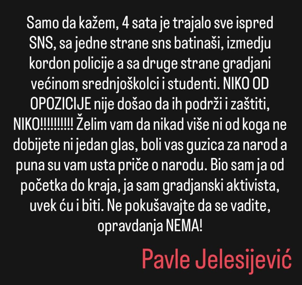 - Samo da kažem četiri sata je trajalo sve ispred SNS, sa jedne strane SNS batinaši, između kordon policije, a sa druge građani, većinom srednjoškolci i studenti. Niko od opozicije nije došao da ih podrži i zaštiti. Niko!!! Želim vam da nikada više ni od koga ne dobijete nijedan glas, boli vas guzica za narod, a puna su vam usta priče o narodu. Bio sam od počerka do kraja, ja sam građanski aktivista, uvek ću i biti. Ne pokušavajte da se vadite, opravdanja nema – naveo je Jelesijević.